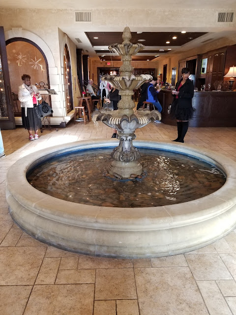 The foyer, just beyond the doors, was a large room with high ceilings and marble-colored tile floors. In the middle, directly in front of us, stood a circular fountain with four levels of pooling. There was a light trickle sound of water as it overflowed slowly from one level into the other. The larger bottom pool held a variety of stones and different denominations of coins. As we walked in, I saw an older black woman toss something shiny into the water and it resulted in a kerplunk sound with a small splash to follow.