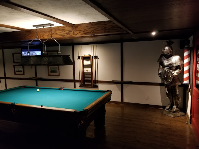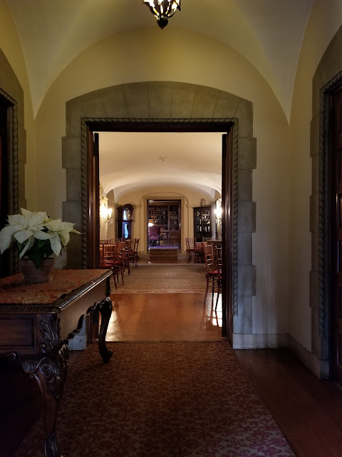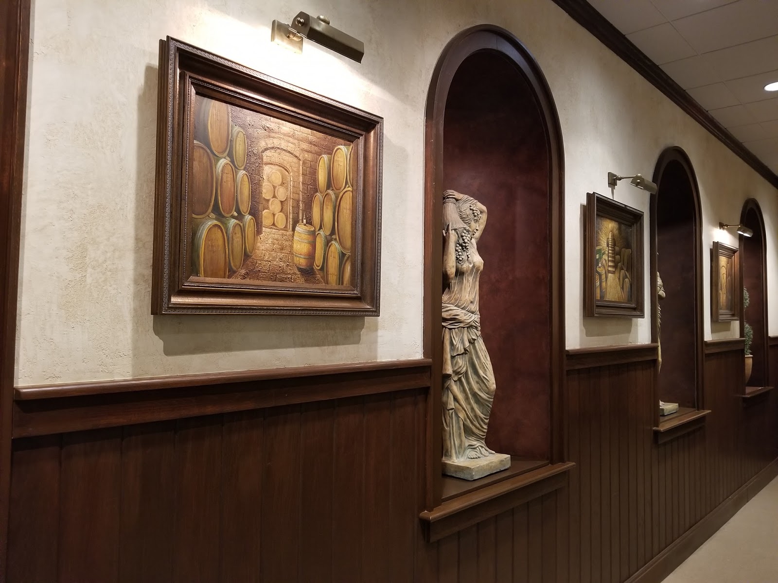 Just beyond this area was a longer and wider hallway of sorts. On the right side were multiple panes of glass. On the left was a wall showcasing both pictures of wine barrels separated by stone carved statues of women holding wine pitchers. The contrasting colors of dark wood that decorated the bottom half of the wall and around the statues looked good against the lighter colored wall that sat above the wood panel. Definitely something I could see in a future iteration of my home.