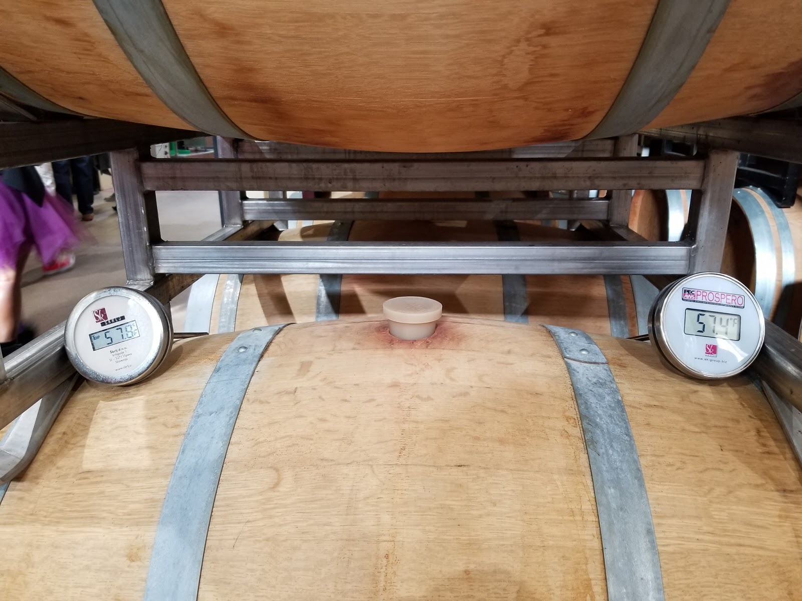 Walking through the fermentation room, we entered into another room with extremely high ceilings. Lining the walls were racks of wooden wine barrels.